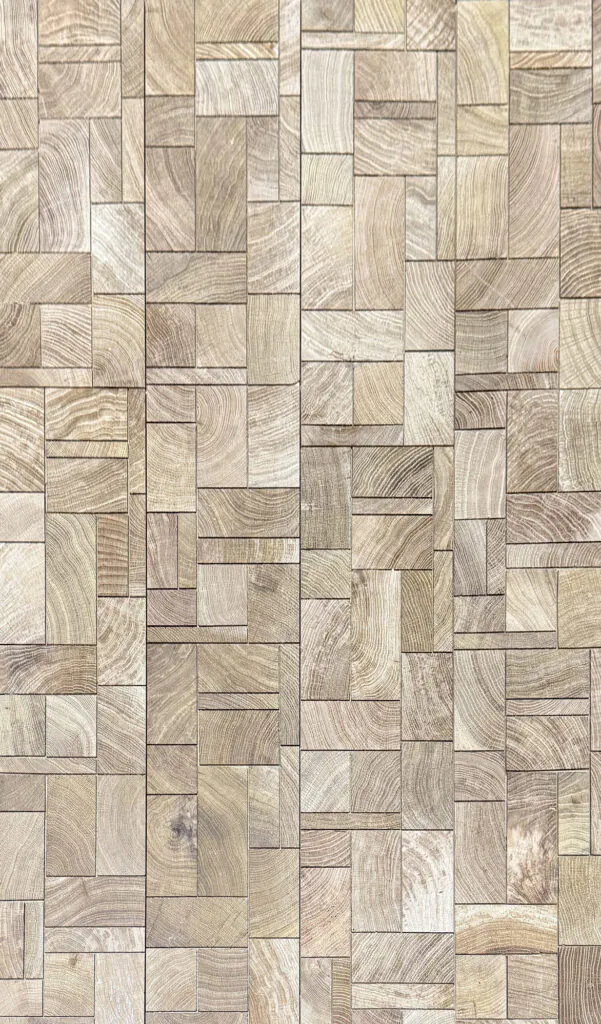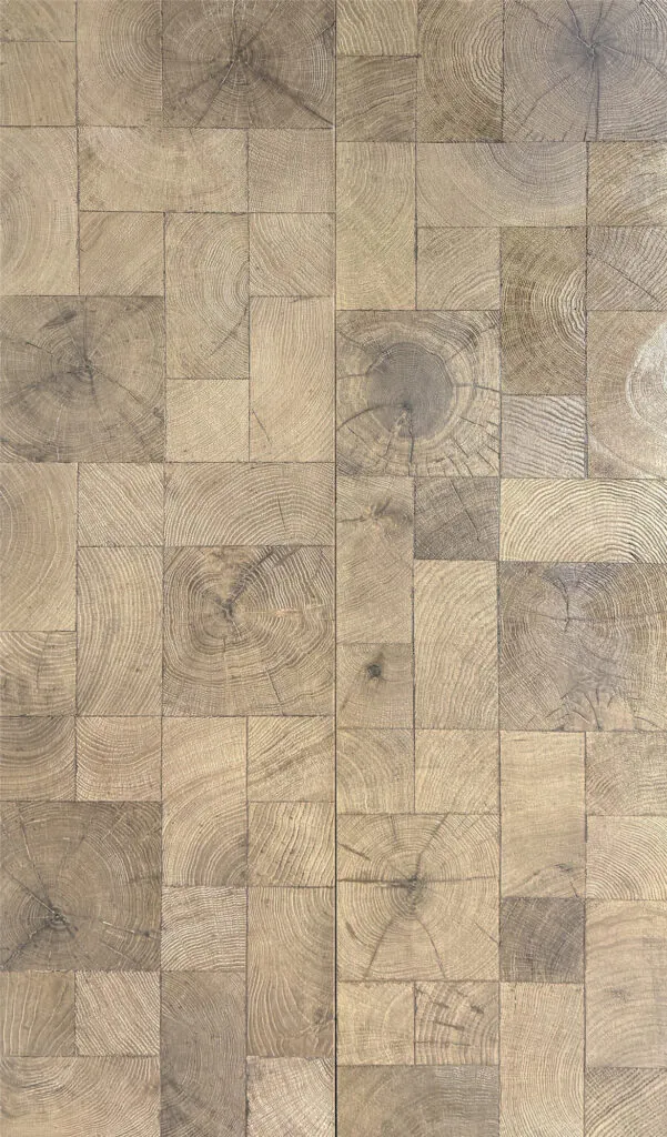 End grain timber flooring is made from blocks or planks that are cut across the grain, rather than along it. This exposes the tree’s inner rings, giving each piece a distinct circular or wave-like pattern that changes depending on the wood species and cut.